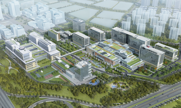 医院建筑由美国设计公司按照国际理念结合中国国情设计, 采用庭院式布局,着力营造自然疗愈空间,采用大面积采光使室内外环境浑然一体。医院设置医学转化中心、模拟训练中心、进修实习楼、学术报告厅、远程教学中心,在门诊和病区设置数字化MDT中心;配套建设人才公寓,设置员工活动中心和室内外运动场,为医务人员创造安全舒适的工作、生活环境。