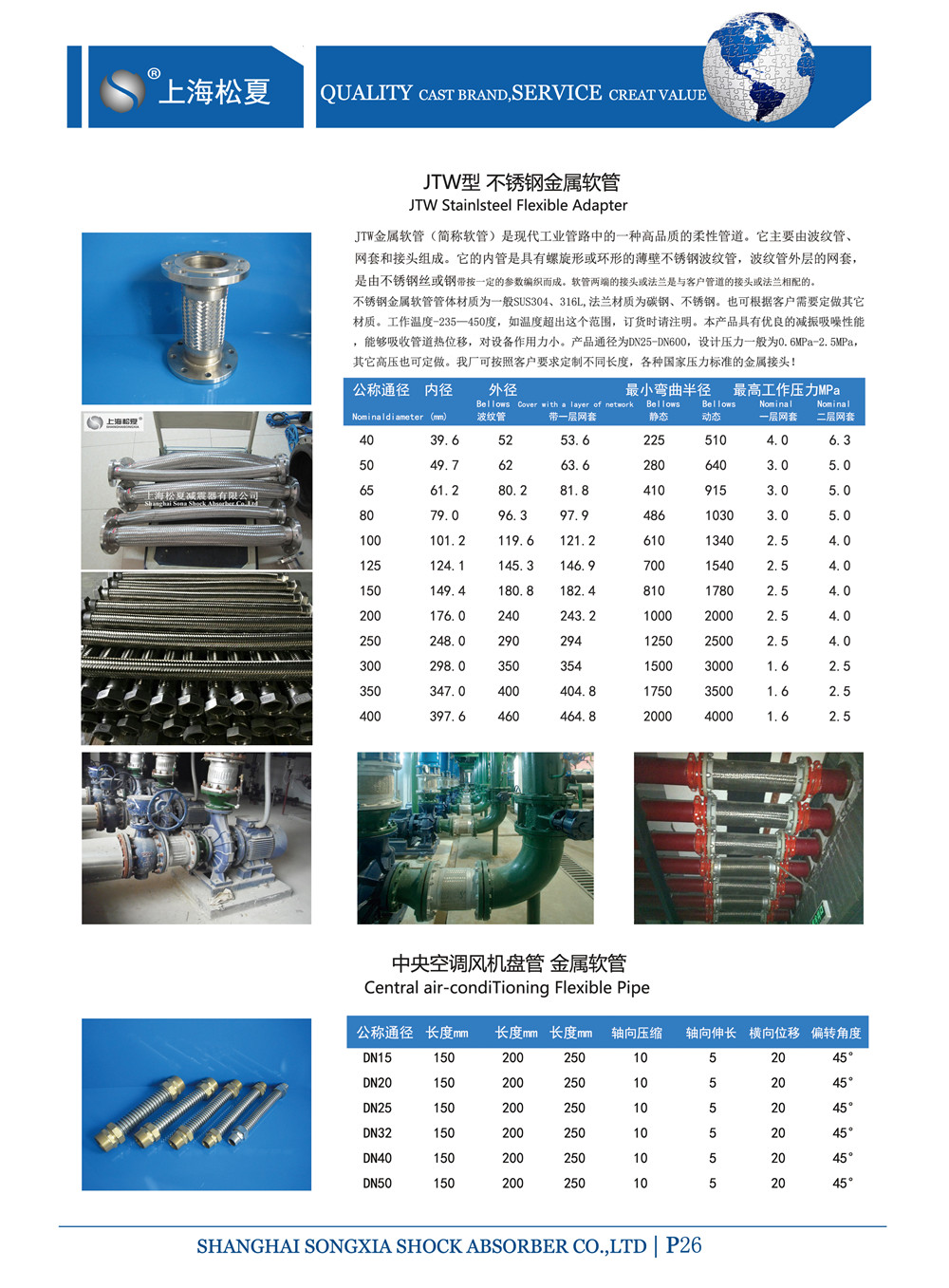 在工程中采用的泵和压缩机等设备在工作状态下,它们会产生振动和噪音,危机工程质量和人体健康,金属软管具有良好的隔振,降噪作用,在泵和压缩机等设备进出口处安装一定长度的金属软管,可以减振、降噪、提高工程质量和使用寿命,但若盲目选用则不仅收不到良好效果,反而会使管路系统提前振坏。我们在借鉴国内外先进技术的基础上,结合产品实际使用状况,规划设计了泵用金属软管JTW系列,供工程设计和施工中选用。